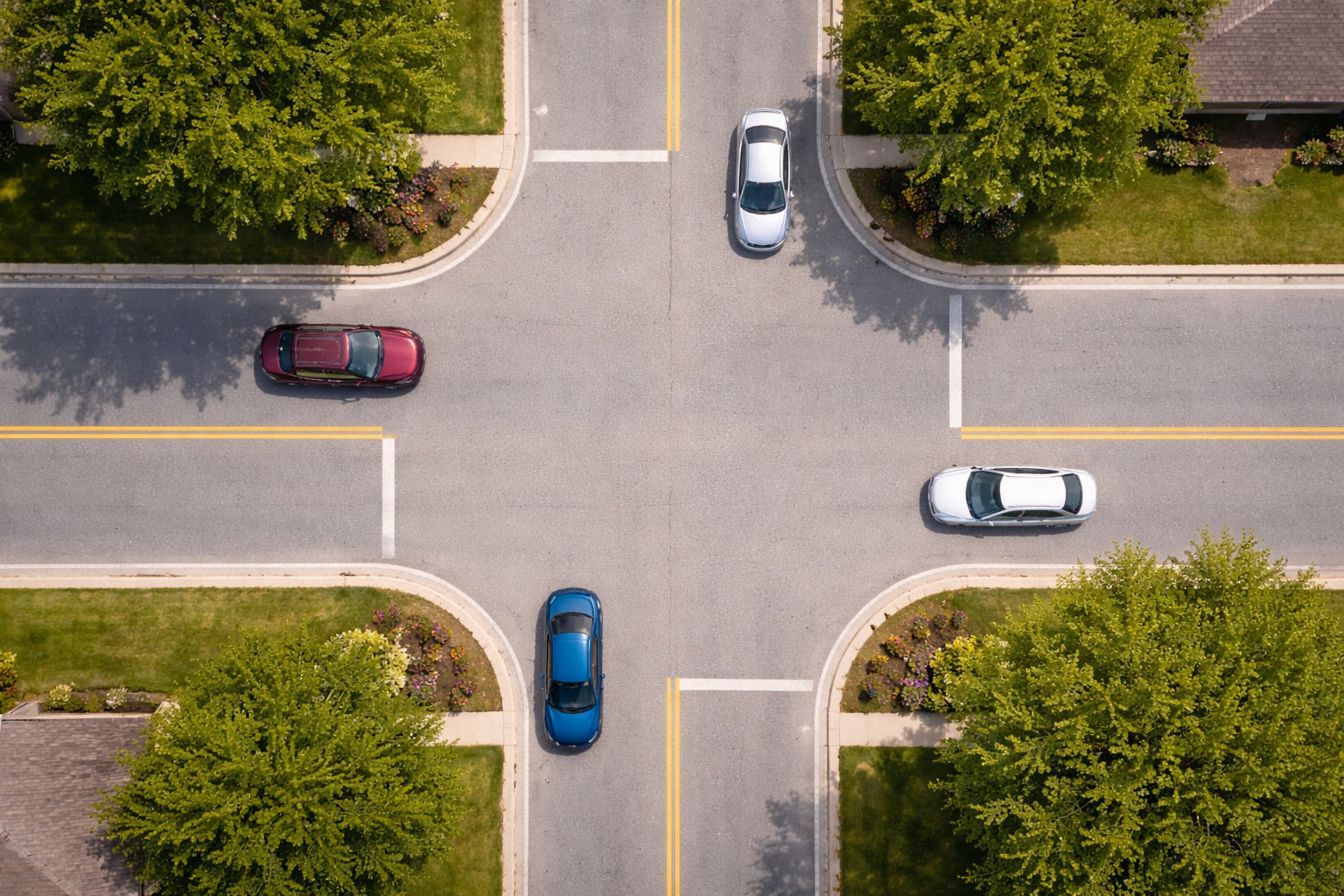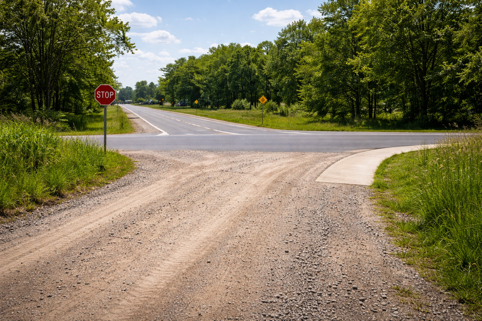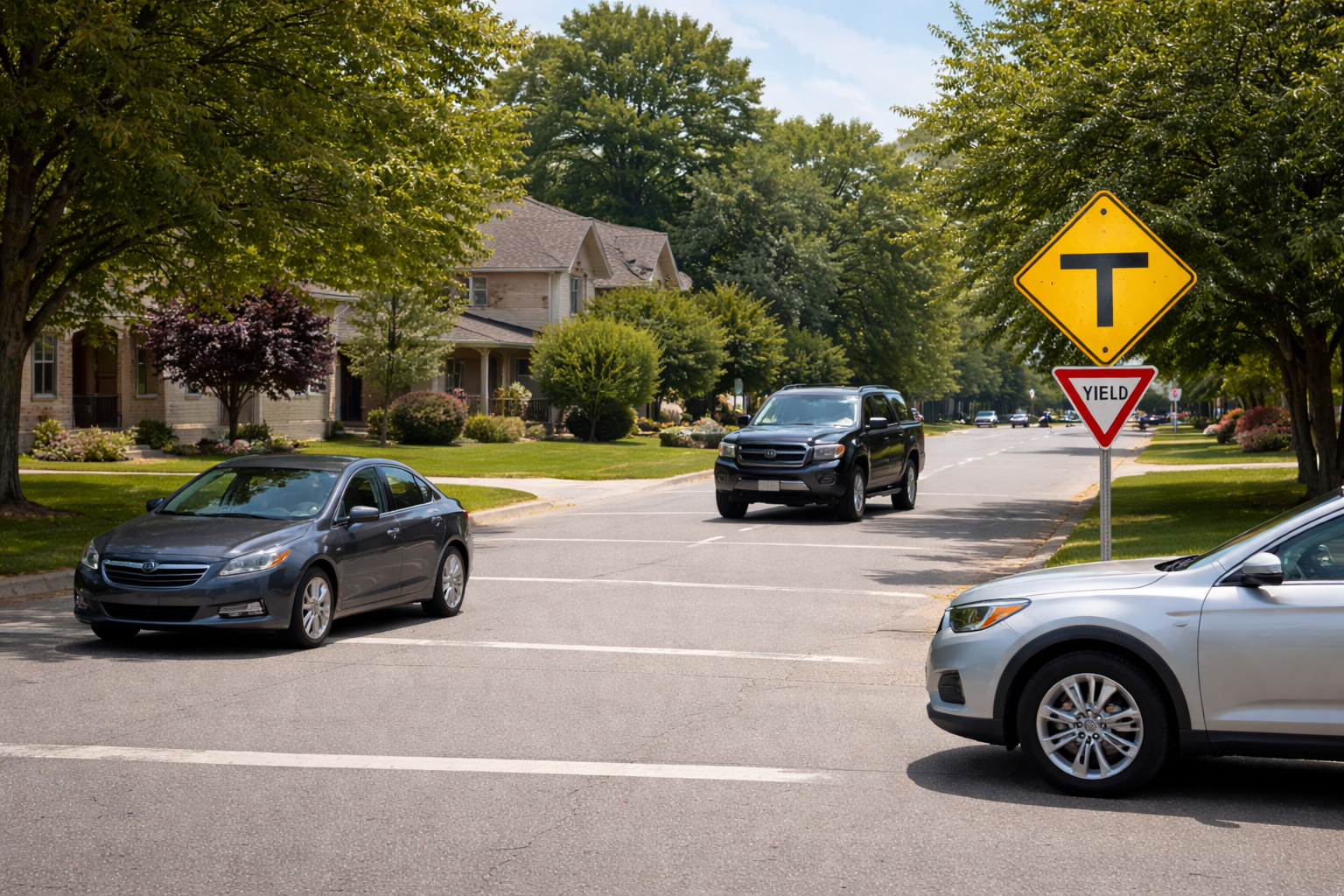 An T-Kreuzungen hat in der Regel die durchgehende Straße Vorfahrt.Das Fahrzeug aus der einmündenden Straße muss warten – auch ohne zusätzliches Vorfahrtsschild.